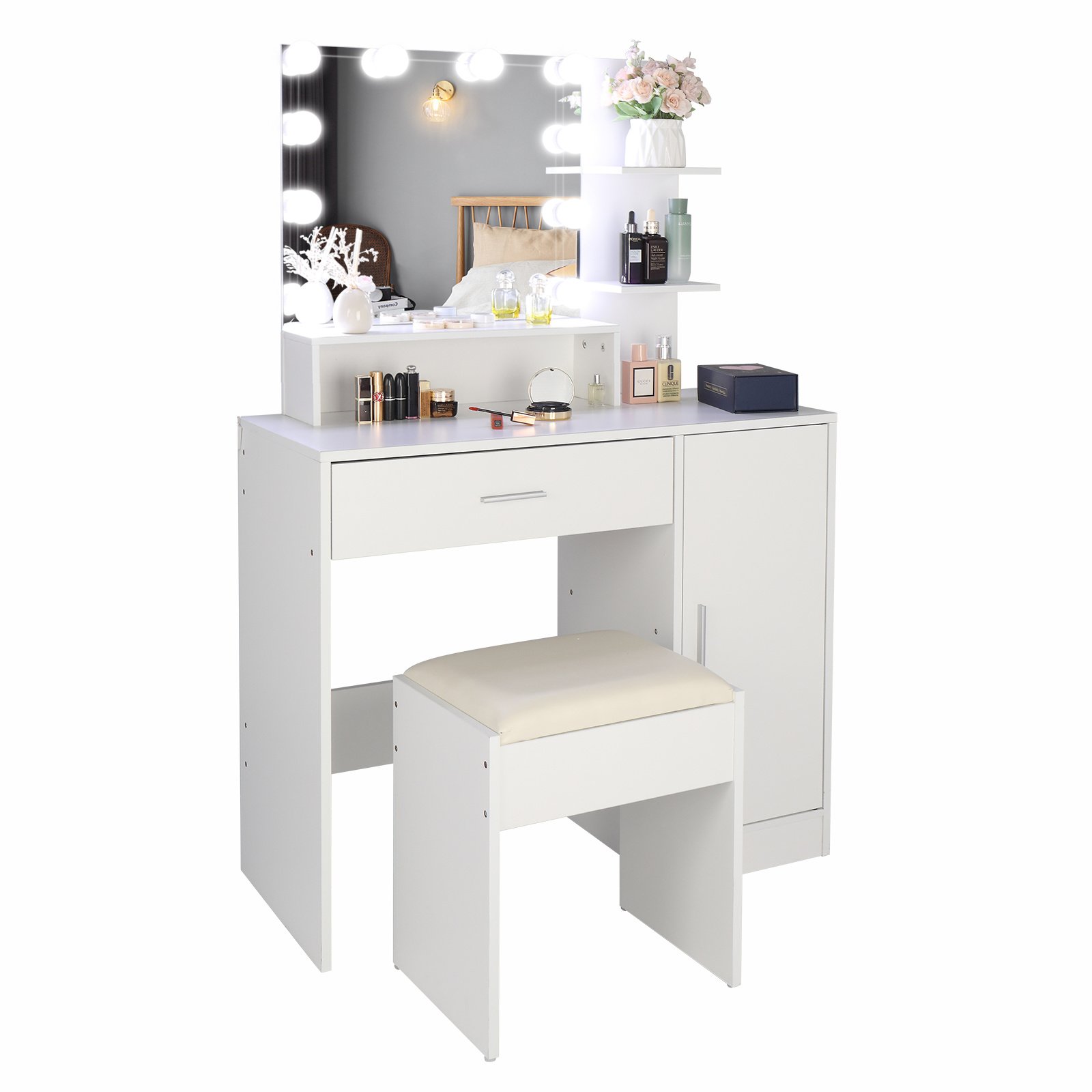 FCH Large Vanity Set with 10 LED Bulbs, Makeup Table with Cushioned Stool, 3 Storage Shelves 1 Drawer 1 Cabinet, Dressing Table Dresser Desk for Women
