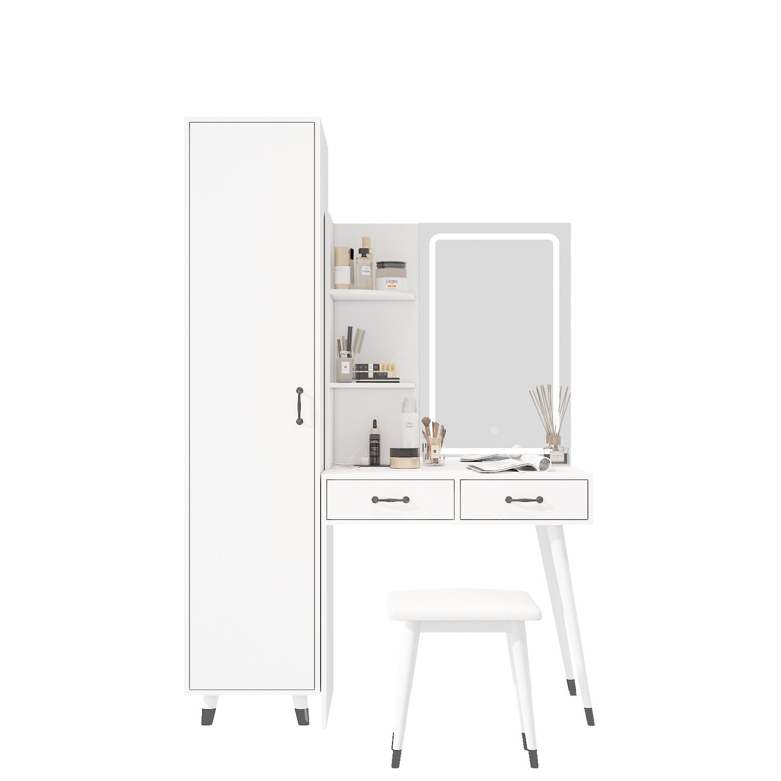 5. Flexible Placement Options: The wardrobe can be positioned on either side of the vanity table or used separately, allowing you to customize the setup to suit your space and preferences.