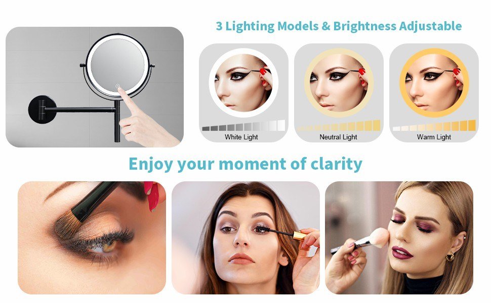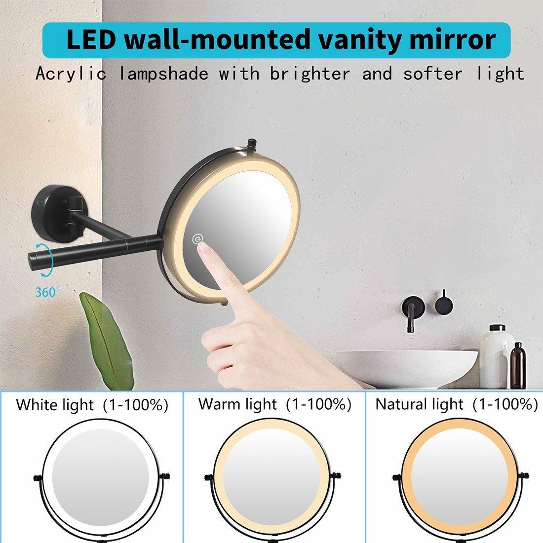 Home > 8 Inch 3 Colors LED Lighted, Wall Mounted Makeup Mirror, Double Sided 1X /10X HD Magnifying, 360° Swivel with Extension Arm, Bathroom Vanity Mirror(B